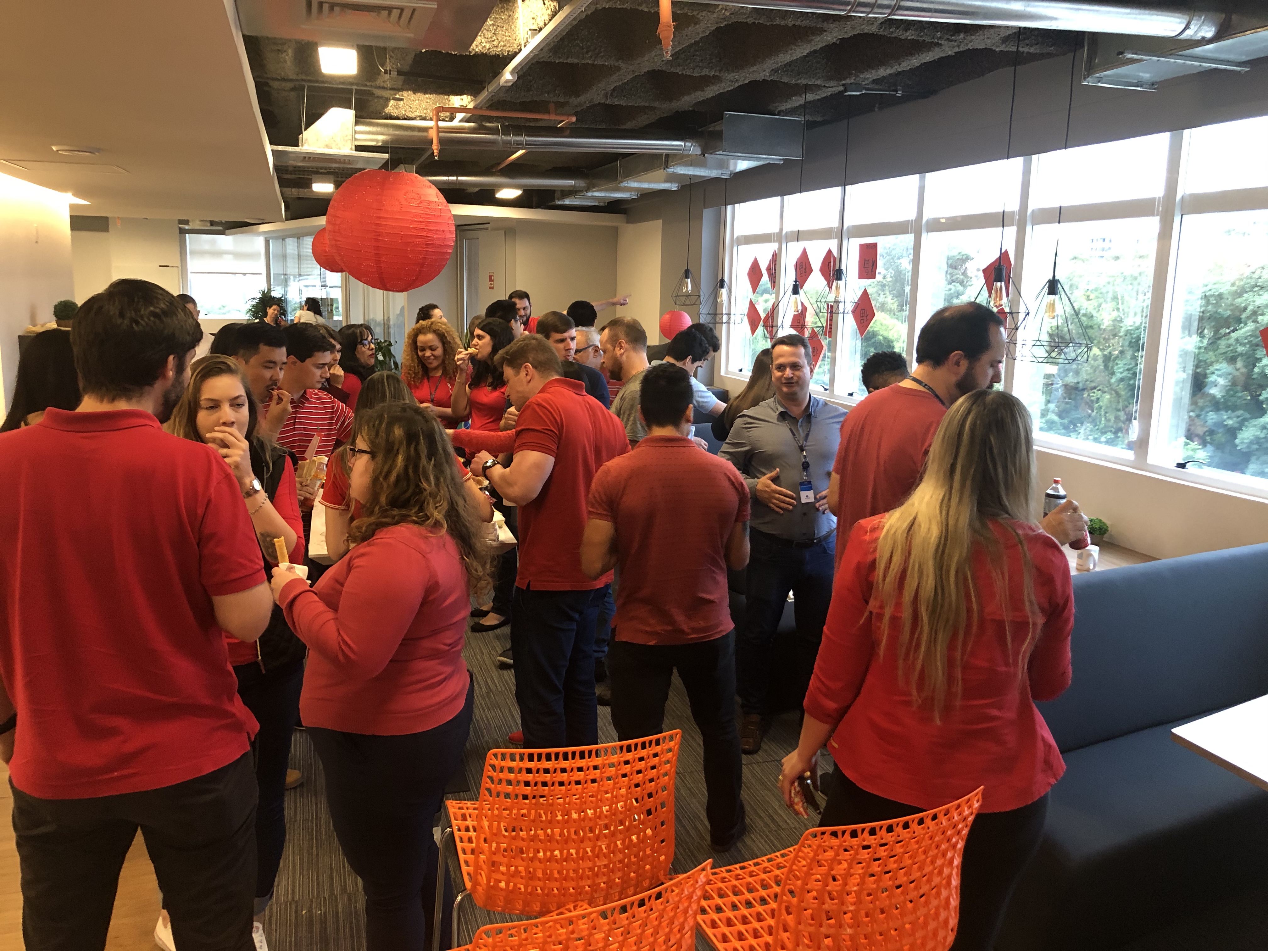 2020年1月17日,巴西公司組織“新春送福”活動。圖為員工們展示作品合影