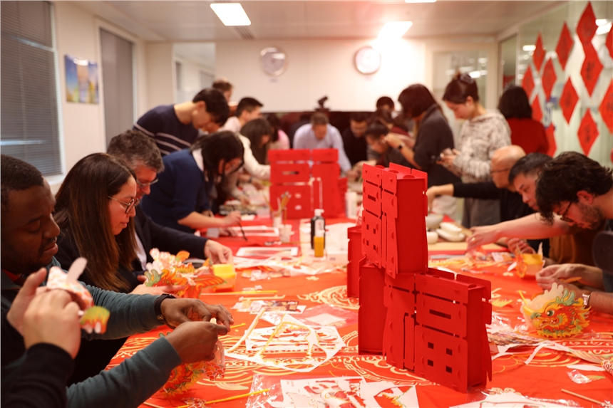 1月27日除夕前日,歐能公司在巴黎總部組織開展了一場春節特色文化融合活動,中外員工齊聚一堂,其樂融融,共同感受濃厚的春節文化;顒蝇F場布置溫馨,年味十足。